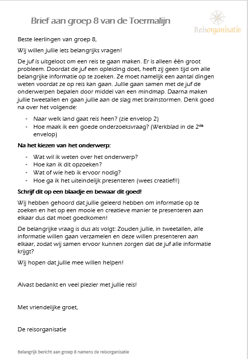 Het project Horizon Verbreden zal gestart worden met een brief aan de leerlingen van groep 8. De brief beschrijft de opdracht die vanuit een reisorganisatie gestuurd is. De leerlingen krijgen de volgende brief te zien: