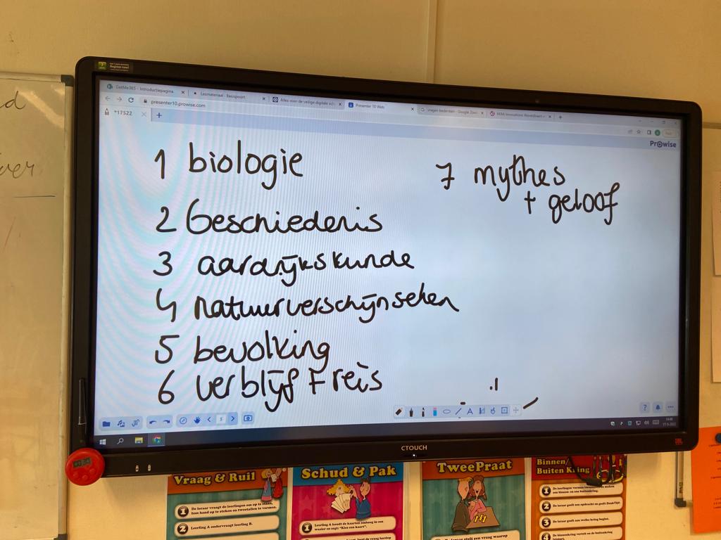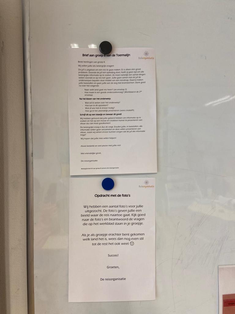 De leerlingen krijgen elke les een brief vanuit de reisorganisatie. De reisorganisatie neemt de leerlingen mee door dit project en vertelt wat wij moeten gaan doen. Ik zal elke les een Genially presentatie “doorgestuurd” krijgen van de reisorganisatie en deze presenteren aan de leerlingen. De leerlingen krijgen het onderwerp in de les ervoor te horen door middel van een brief. Zij mogen opschrijven wat zij graag over dit onderwerp willen weten. Ik zal dit dan meenemen tijdens de presentatie (die ik natuurlijk zelf maak, de reisorganisatie). Aan het eind van de les schrijven de leerlingen op de tijdlijn, die achterin de klas hangt, op wat zij geleerd/ gedaan hebben en wat zij ervan vonden. Als eindopdracht krijgen de leerlingen de tijd om de informatie te ordenen en dit op een creatieve en leuke manier te presenteren aan de andere leerlingen, de reisorganisatie en mij. Deze presentaties zullen plaatsvinden in de week van 6 juni 2022.